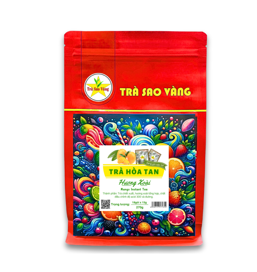 Trà Hoà Tan Sao Vàng với nhiều hương vị tự nhiên của các loại trái cây như dâu, đào, xoài và nhiều loại khác. Trà Hòa Tan Sao Vàng không chỉ mang đến một ly trà thơm ngon mà còn chứa đựng đầy đủ vitamin và khoáng chất từ trái cây, giúp người thưởng thức vừa giải khát, vừa bổ sung dinh dưỡng.
